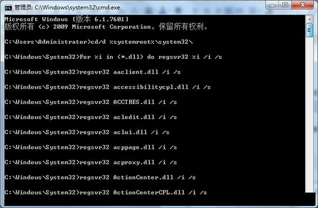 2、在命令提示符下繼續輸入第二個命令:For %i in (*.dll) do regsvr32 %i /i /s