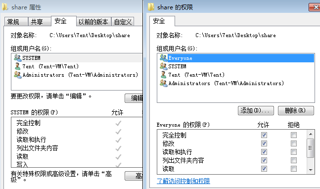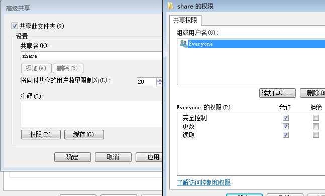 右擊需要共享的文件夾 – 屬性 – 共享 – 高級共享  權(quán)限設(shè)為everyone