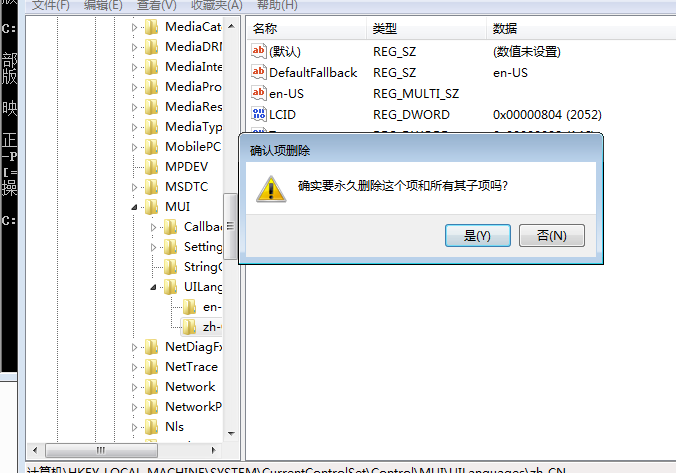 5. 執行完成后打開注冊表管理器regedit,刪除HKEY_LOCAL_MACHINESYSTEMCurrentControlSetContro lMUIUILanguagezh-CN (根據自己情況,刪除不想要的原語言),記得刪除前導出一份備份,這樣就可以恢復原有的簡體中文