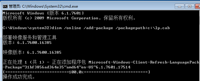 4. 用管理員身份運行cmd ,執行 dism /online /add-package /packagepath:d:lp.cab {d:lp.cab 為文件所在的位置}